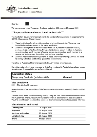 【成功案例】恭喜Z同学澳洲485工作签证获批