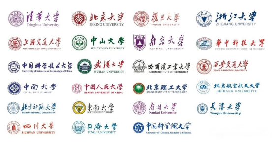 清华大学,北京大学,复旦大学,浙江大学,上海交通大学,中国科技技术大学,中山大学,南京大学,华中科技大学,武汉大学,西安交通大学,哈尔滨工业大学,中南大学,中国人民大学,北京航天航空大学,北京理工大学,北京师范大学,东南大学,南开大学,天津大学,同济大学,四川大学,中国科学院大学。