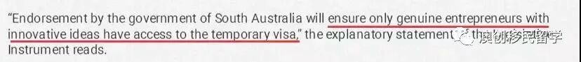 关于商业计划书得到南澳政府认可(Endorsement)这点,法律文件解释为:“获得南澳政府的认可可是为了确保,只有持有创新理念的真实创业者才能申请该签证”